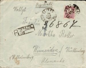 DESCRIÇÃO:Ano 1927 - Envelope registrado circulado de Curitiba para a Alemanha, com chegada. Selo 1.000Rs Ruy em franquia isolada....