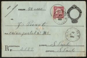 DESCRIÇÃO:Ano 1927 ? - Inteiro Postal Remessa de Valor (EV 7DE - com decalque interior - não catalogado) selo 1.000Rs Ruy circulado...