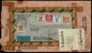 DESCRIÇÃO:Ano 1955 - Envelope registrado em formato maior, circulado de São Paulo para a Alemanha, com grande etiqueta da aduana alemã. 5...
