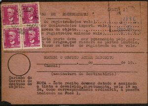 DESCRIÇÃO:Ano 1963 - Aviso de Recebimento (AR) circulado de Lages para ? Quadra selo Bisneta de 5,00 com carimbo ilegível....