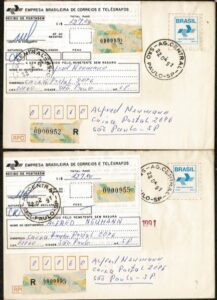 DESCRIÇÃO:Ano 1991 - 2 Envelopes registrados circulados dentro da cidade de São Paulo com chegada. Ambas com etiqueta de registro # 675...