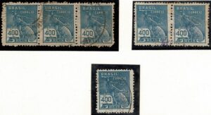 DESCRIÇÃO:◉ 203D - 400Rs - Chapa Riscada. 3 exemplares: Isolado, em par e trinca (nos múltiplos, 1 com a variedade ) –...