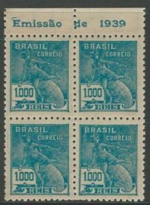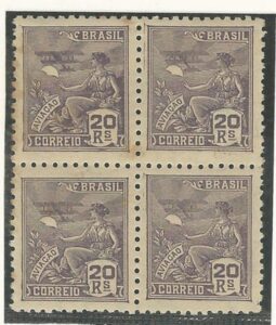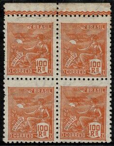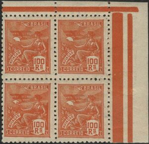 DESCRIÇÃO:**/* 329A - 100Rs Aviação - Quadra GOMADA - Papel fino, filigrana vertical. No catálogo enciclopédico, constava só "sem goma" - Curioso...