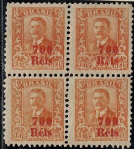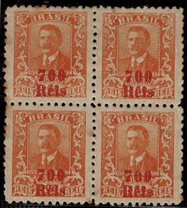 DESCRIÇÃO:* 339Es - 700/500 - Quadra, sem filigrana nos 4 selos. Selo da posição 2 com variedade: S de Reis (da sobrecarga)...