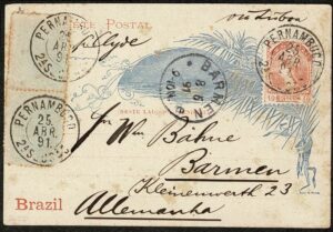 DESCRIÇÃO:Ano 1891 - Inteiro Postal tipo BP (40Rs) par vertical 20Rs (selo inferior, com defeito no canto direito) circulado de Pernambuco para...