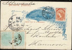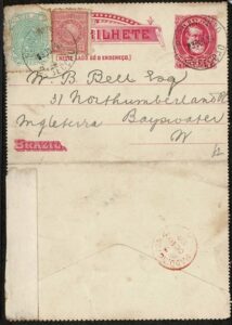 DESCRIÇÃO:Ano 1894 - Inteiro Postal CB 19? (80Rs) selo Cabecinha selo 20Rs (com defeito no picote) circulado de Pernambuco para a Inglaterra,...