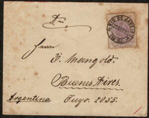 DESCRIÇÃO:Ano 1893 - Envelope circulado do Rio de Janeiro para a Argentina, com chegada. Selo 73 (200Rs) de ponta cabeça. Pontos de...