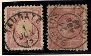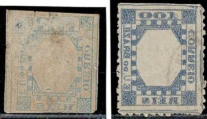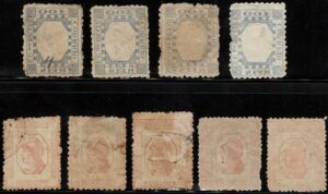 DESCRIÇÃO:◉ 79N (Quadro no verso) - 2 selos em diferentes graus de transparência, mas com senões. Um deles inclusive aparentemente sem picote,...