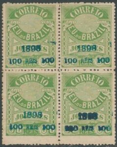 DESCRIÇÃO:(*) 128a - 100/50 - Sobrecarga na cor azul. Quadra. Selo da posição 3 com senão e não cotado - 300 UF...