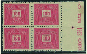 DESCRIÇÃO:(*) 53 - 100Rs - Quadra sem carimbo e sem goma - 720UF.......