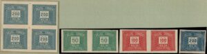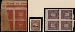 DESCRIÇÃO:(*) PROVAS - Cifra horizontal - 9: 50Rs verde (par) 100Rs vermelho (par) e 200Rs (quadra na cor clara e selo isolado...