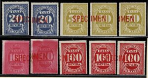 DESCRIÇÃO:**/*/(*) SPECIMEN - Cor carmim: facial 100Rs x 5 e Cifra de cor - facial 20Rs x 2 e 50Rs x 3...