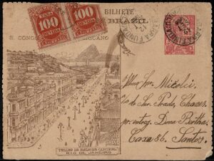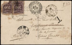 DESCRIÇÃO:Ano 1906 - Inteiro Postal tipo CB73, circulado da Barra Funda (SP) para Santos. Taxado, com selo 100Rs Cifra, pois o porte...