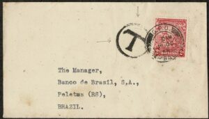 DESCRIÇÃO:Ano 1949 - Envelope vindo de Barbados para Pelotas (RS) com chegada. Belo carimbo "T" dentro de círculo marca transorma de distribuição....