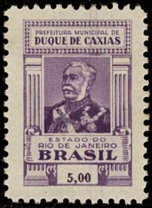 DESCRIÇÃO:Rio de Janeiro - * MUNICIPAL - Duque de Caxias - Ano 1955 ? Facial 5,00 violeta, figurando Duque de Caxias. Não...