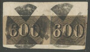 DESCRIÇÃO:◉ 18 - 600Rs - Par horizontal sobre fragmento com carimbo mudo. Margens conforme imagem - 1.400 UF...