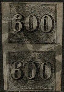 DESCRIÇÃO:◉ 18 - 600Rs - Par vertical com carimbo mudo. Margens conforme imagem. Pequenina raspagem no selo superior - 1.400 UF...