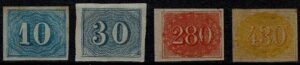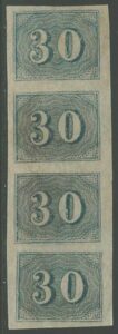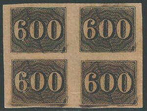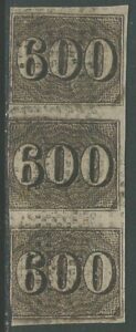 DESCRIÇÃO:◉ 18 - 600Rs - Trinca vertical. Margem esquerda com corte dentro do quadro - 3.250 UF...