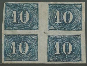 DESCRIÇÃO:(*) 19D - 10Rs - Quadra nova sem goma e forte reincisão no selo da posição 2. Os 2 selos inferiores com...