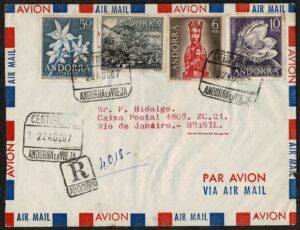 DESCRIÇÃO:ANDORRA ESPANHOLA - Ano 1967 - Envelope registrado circulado para o Rio de Janeiro, com chegada. Selos Yvert 58, 60, 61 e...