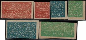 DESCRIÇÃO:(*) (CACHEMIRA - Estado Principesco da India) 3 cores diferentes: Vermelho, Azul e verde - 1 par e 1 selo isolado de...