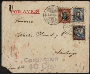 DESCRIÇÃO:CHILE - Ano 1929 - Envelope aéreo, registrado ? circulado de Valparaizo para Santiago com chegada. 2 selos regulares Aéreo 20 (3...