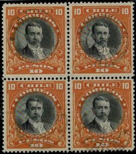 DESCRIÇÃO:CHILE ◉ 100 - Quadra com carimbo circular em cada um dos selos....