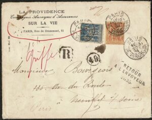 DESCRIÇÃO:FRANÇA - Ano 1894 - Envelope registrado circulado internamente com chegada e devolvido com varios carimbos aplicados na frente e no verso...