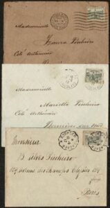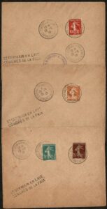 DESCRIÇÃO:FRANÇA - Ano 1917 - 3 envelopes circulados internamente, todos com selo Yv 150 (Órfãos de guerra) em franquia isolada. Os selos...