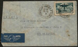 DESCRIÇÃO:FRANÇA - Ano 1936 - Envelope aéreo circulado para o Rio de Janeiro, com chegada. Selo Yv 321 (10Fr Travessia do Atlântico)...