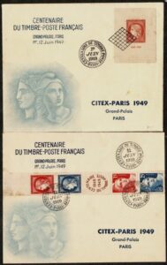DESCRIÇÃO:FRANÇA - Ano 1949 - 2 Fdcs com série Yv 830/833 e selo 841. Carimbo comemorativo alusivo ao Centenário do selo. Pontos...