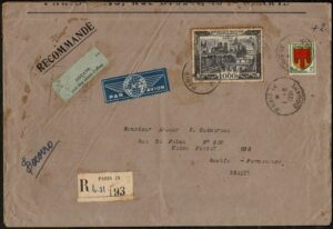 DESCRIÇÃO:FRANÇA - Ano 1951 - Envelope registrado formato maior, circulado para Pernambuco com chegada. Selo regular aéreo 29 (1.000Fr vista de Paris)...