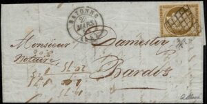 DESCRIÇÃO:FRANÇA - HISTÓRIA POSTAL - Ano 1850 - Sobrecarta completa circulada internamente e porteada com selo Yvert 1 (10c) com carimbo tipo...