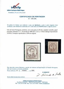 DESCRIÇÃO:(*) GUINÉ PORTUGUESA - Yvert 28(A) e Afinsa 28. Picote 12,5 - Foto Certificado de Expertização Inexfip (Portugal) 100 Euros no Yvert...