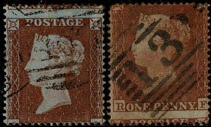 DESCRIÇÃO:INGLATERRA ◉ Yvert 8 - Dois selos com marcantes deslocamentos do picote. Em um, não aparece a palavra One Penny na parte...