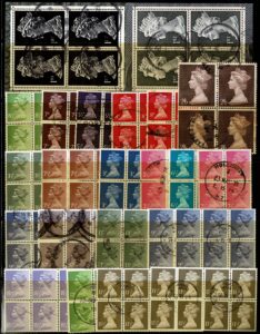 DESCRIÇÃO:INGLATERRA ◉ QUADRAS COM CARIMBO EMISSÃO MACHIN - Cartela com 33 diversas. Incluso alguns múltiplos maiores (até blocos de 8) calculados como...