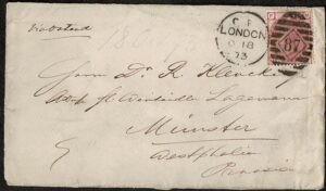 DESCRIÇÃO:INGLATERRA - Ano 1873 - Frente de envelope ou sobrecarta circulado para a Alemanha. Provável selo Yvert 51 com nº de plancha...
