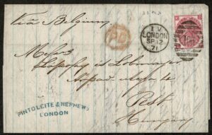 DESCRIÇÃO:INGLATERRA - HISTÓRIA POSTAL - Ano 1871 - Sobrecarta completa circulada para a Hungria. Selo Yv 33 (Plancha 6) com carimbo numeral...
