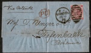 DESCRIÇÃO:INGLATERRA - HISTÓRIA POSTAL - Ano 1872 - Sobrecarta completa circulada para a Bohemia, com chegada. Selo Yv 33 (Plancha 9) e...