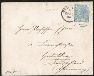 DESCRIÇÃO:INGLATERRA - HISTÓRIA POSTAL - Ano 1880 - Envelope circulado para a Alemanha. Selo Yv 57 (Plancha 19) 75 Libras pelo catálogo...