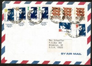 DESCRIÇÃO:ISRAEL - Ano 198? - Envelope circulado para os Estados Unidos com Marca de distribuição - 7 selos regulares + Par Yvert...