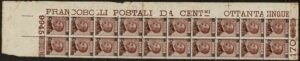 DESCRIÇÃO:* ITÁLIA - Sassone 135 - Bloco de 20 vertical. Picote parcialmente interrompido na lateral esquerda, nos 10 selos da fileira. Canto...