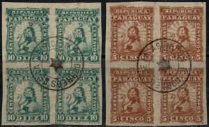 DESCRIÇÃO:PARAGUAI ◉ Michel 7/8ND - Reimpressão oficial em quadras SEM PICOTE. Provável carimbo de favor em ambas. Vistoso item...