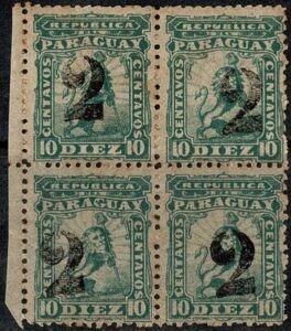 DESCRIÇÃO:PARAGUAI * 13 - Quadra. Selo inferior esquerdo com vinco....