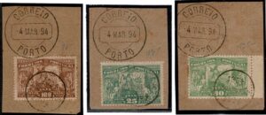 DESCRIÇÃO:◉ PORTUGAL - 100, 101, 103 e 104 - Todos sobre fragmento carimbo alusivo de 1º dia (4.3.1894)....