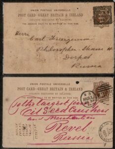 DESCRIÇÃO:RÚSSIA - 2 Inteiros Postais tipo Bilhete Postal, facial 1 Penny, ambos vindo da Inglaterra e com chegada. Um deles com furos...