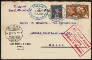 DESCRIÇÃO:SUÍÇA - HISTÓRIA POSTAL - Ano 1925 - Cartão com todos os carimbos alusivos ao 1° Vôo : Basel/Mannheim. Selo regular Aéreo...