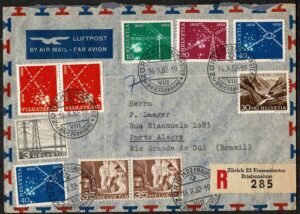 DESCRIÇÃO:SUIÇA - Ano 1952 - Envelope registrado circulado para Porto Alegre com chegada. Selos Yvert 481, 488x2, 517x2, 518, 519, 520x2 e...