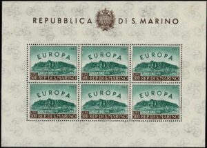 DESCRIÇÃO:SÃO MARINO **/* 523 - Mini Folha com 6 exemplares. Selos ** e mínima mancha de ferrugem na margem - 225 Euros...