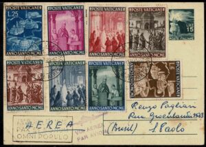 DESCRIÇÃO:VATICANO - Ano 1949 - Inteiro postal Italiano série completa Yvert 150/57, circulado de Roma para São Paulo, com chegada....